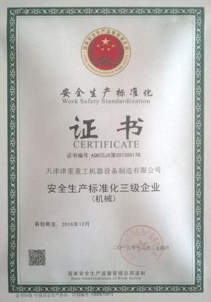 2013年12月我公司被天津市津南區安全生產管理局認定為安全生產標準化三級企業(機械)并頒發證書。